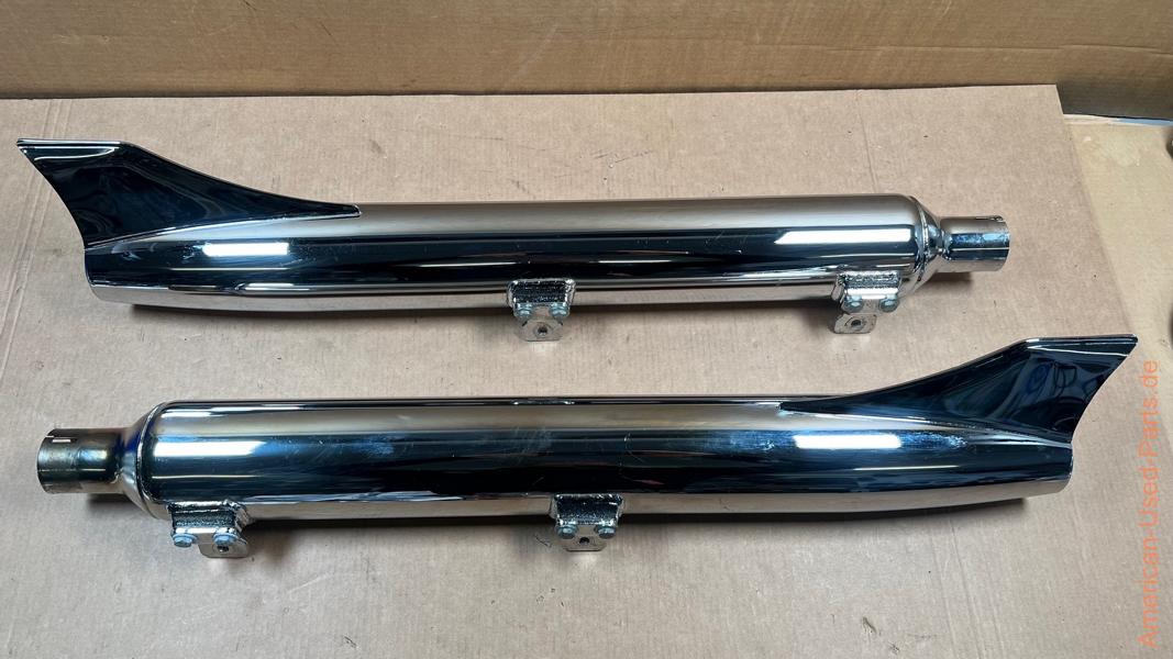 Auspuffdämpferset Fishtail OEM 65655-00 + 65679-00 US Ausführung original HD für Softail Modelle 2000-2006 mit Crossover Auspuffkrümmeranlage (rechts + links) mit Dämpfereinsätzen + Haltern, ein Schrapper vom aufsetzen (angebaut nicht zu sehen) sonst guter Zustand, Neupreis HD 1210 € 490,- € |
